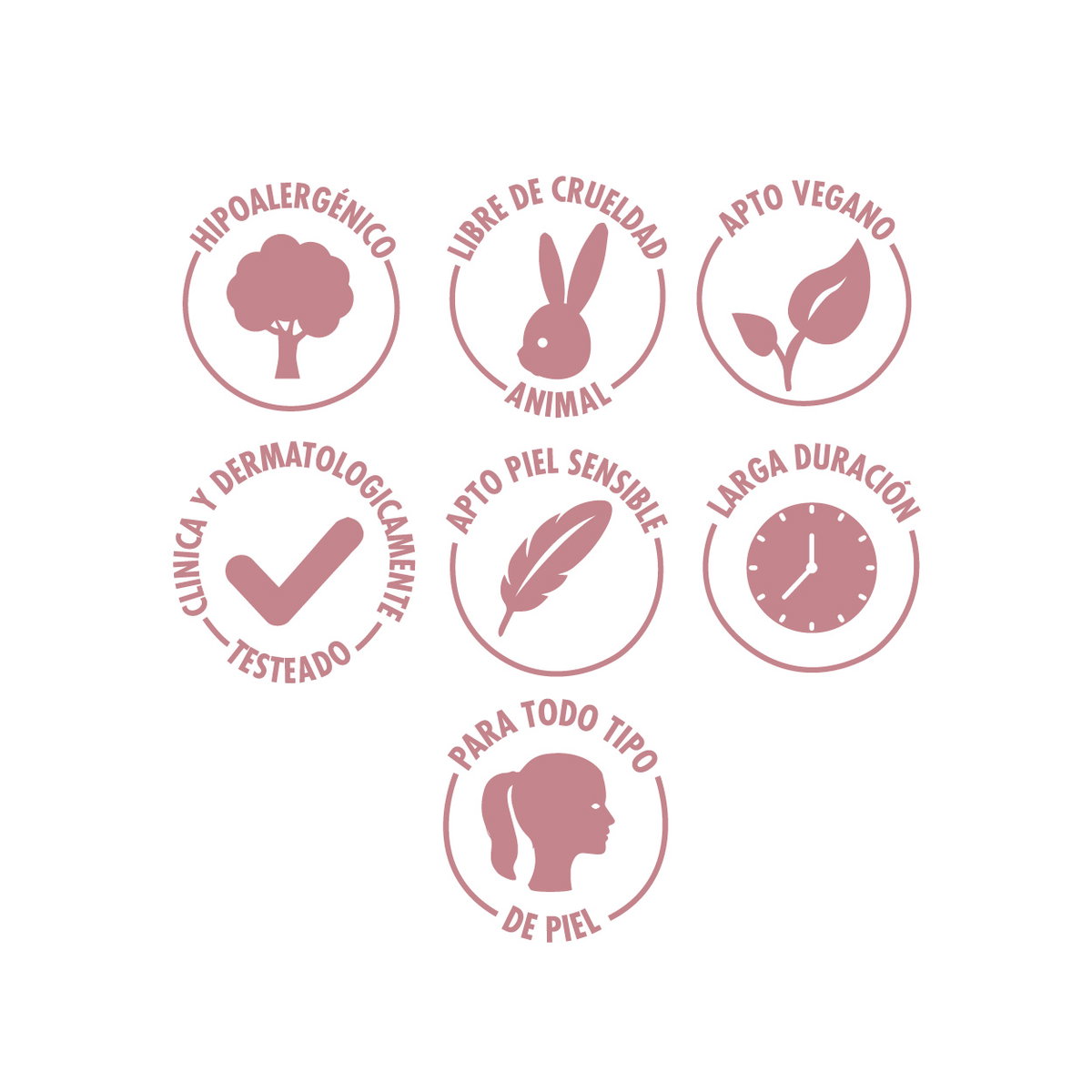 Testeado clínica y dermatológicamente – Hipoalergénico – Libre de crueldad animal – Vegano – Apto para piel sensible – Larga duración